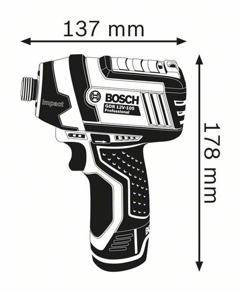 Bosch GDR 12V-105 är en kompakt slagskruvdragare med 1/4"-fäste. Skruvdragaren drivs av Bosch 12V batterier och är även komatibel med 10,8V-systemet.