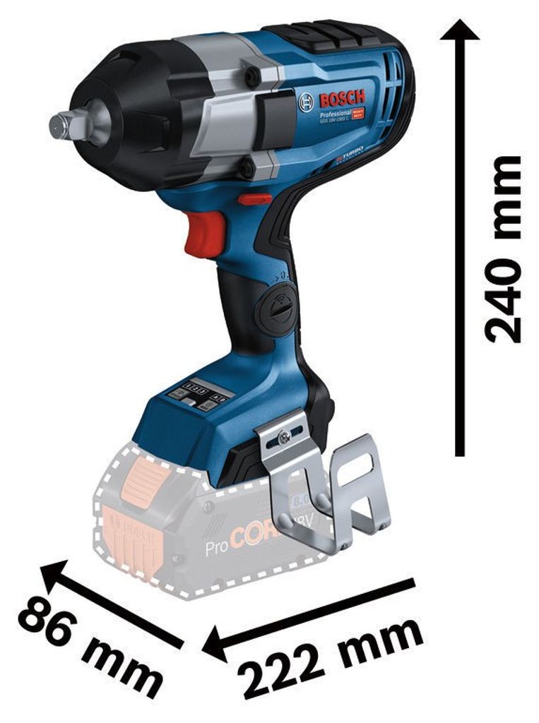 Bosch GDS 18V-1000 C Professional är en kraftfull och pålitlig 1/2” mutterdragare med BITURBO Brushless-teknik, optimerad för ProCORE18V-batterier. Med 1000 Nm åtdragningsmoment och 1600 Nm brytmoment hanterar den även de tuffaste uppgifterna inom bygg, industri och fordon. Tre inställningar för hastighet och moment ger hög precision och mångsidighet. Den nya slagmekanismen ger maximal prestanda, och den robusta konstruktionen säkerställer lång hållbarhet och effektivitet. Kompatibel med Bosch Professional 18V System och AMPShare.