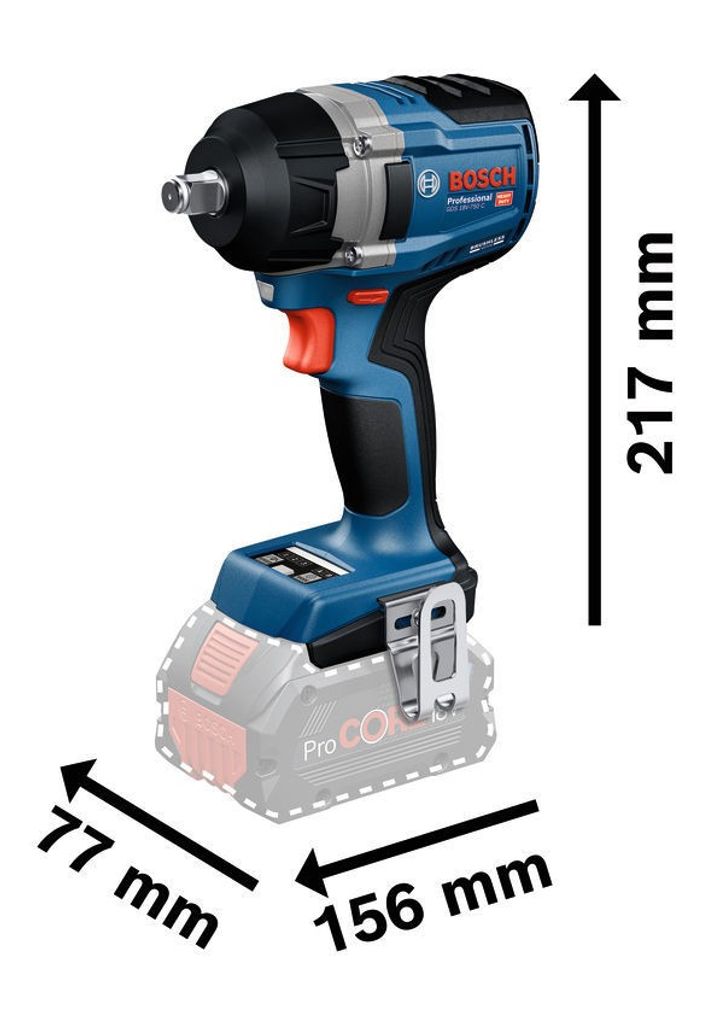 Auto Bolt Release (ABR) förhindrar att muttrar och bultar faller av vid lossning, medan den innovativa Secure Socket Release säkerställer att hylsorna inte fastnar – en funktion som kan aktiveras via Bosch PRO360-appen. Två integrerade LED-lampor ger optimal belysning av arbetsområdet.