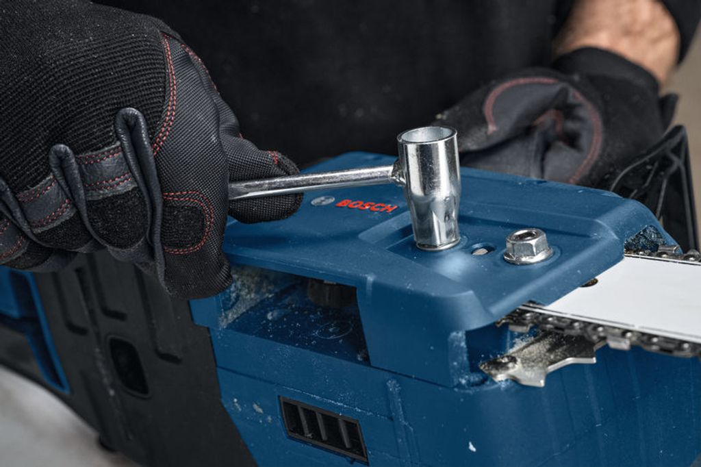 Verktygsnyckel för kedjejustering medföljer och förvaras på maskinen