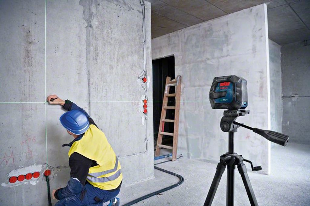 Bosch GLL 2-15/LB är en grönlaser med tydliga linjer och en tålig design med stötskydd och IP 64 klassning för att tåla de tuffa miljöerna på en byggarbetsplats.