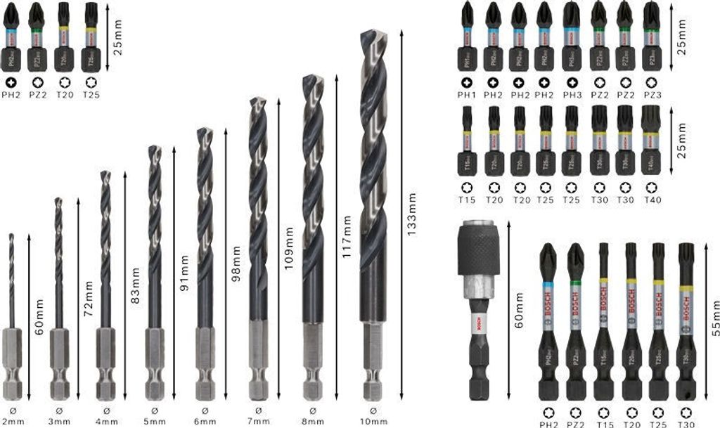 Bosch PRO Impact Metal Set är det perfekta valet för inredningsmontörer, installatörer och hantverkare som behöver högkvalitativa bits och metallborr för dagligt arbete. Bitsen är tillverkade av modifierat stål, vilket ger optimal styrka och hållbarhet, medan den förlängda torsionszonen effektivt absorberar vridmomentspänningar och minskar risken för skador.