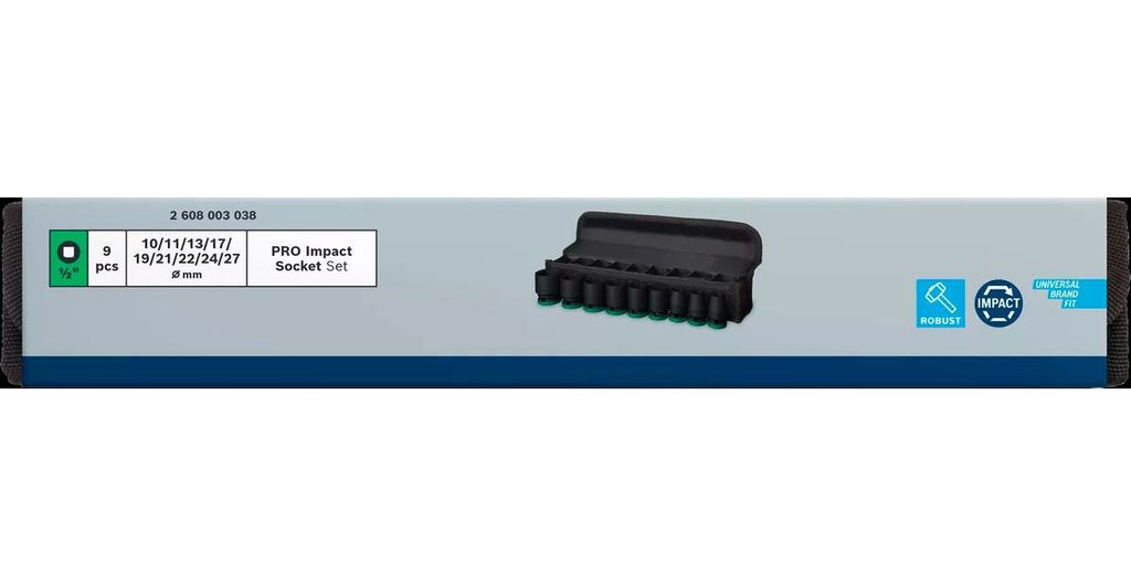 Bosch PRO Impact Socket Set 1/2” är designat för professionella hantverkare, mekaniker och industriella arbeten, där hållbarhet och precision är avgörande. Satsen innehåller 9 hylsor med standard 1/2” fäste, vilket gör den kompatibel med både mutterdragare och hylsnycklar.