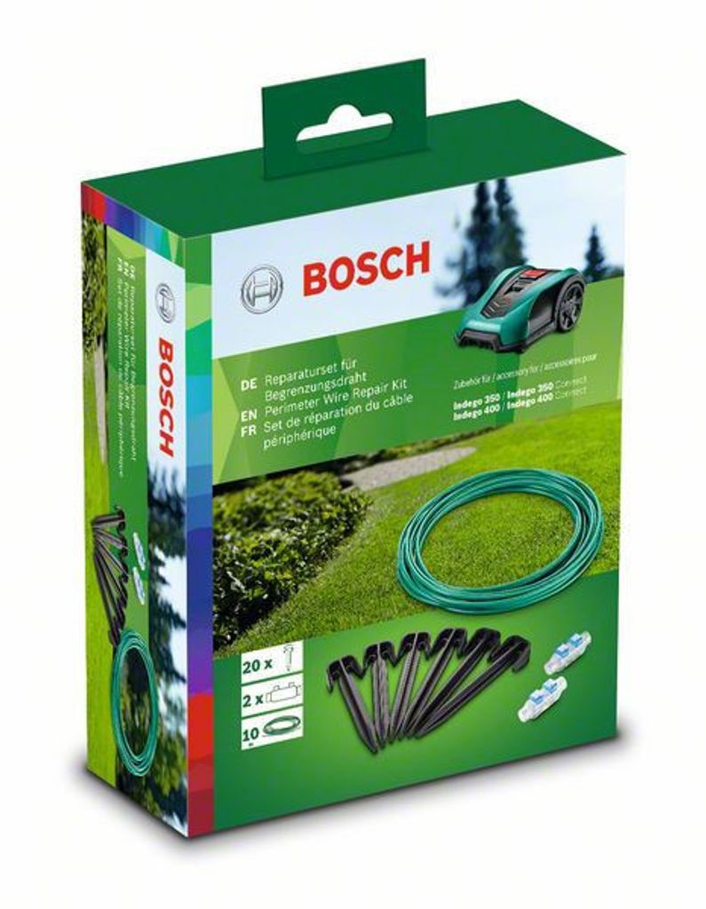 - Inkluderar 10 m begränsningstråd, 20 fästpinnar och 2 kabelanslutningar