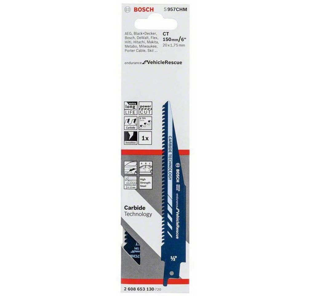 Bosch Tigersågblad S 957 CHM VehicleRescue är ett tigersågblad med Bosch Karbidteknik som skär igenom de tuffaste och hårdaste materialen. Tigersågbladet är extremt hållbart och är förmodligen det bästa tigersågbladet på marknaden för fordonsplåt och stålm