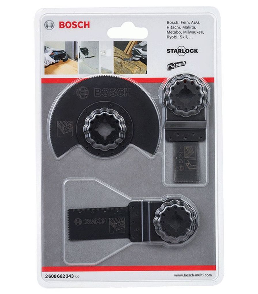 Bosch 3-delars universalsats. Alla grundfunktioner i en och samma sats (sågning, slipning och skrapning). Passar för trä och metall.