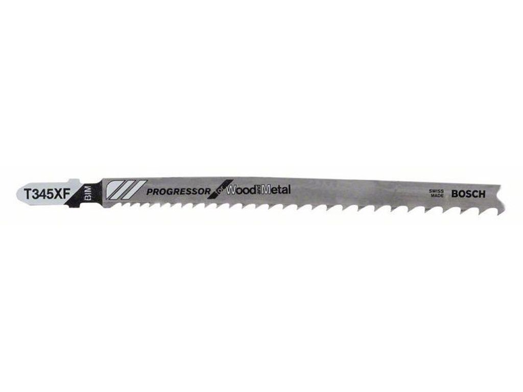 Bosch T345XF är ett sticksågblad för byggvirke med spik (<65 mm), träfibermaterial, plast, plåt, rör/profiler, inkl. aluminium (ø 3-10 mm).