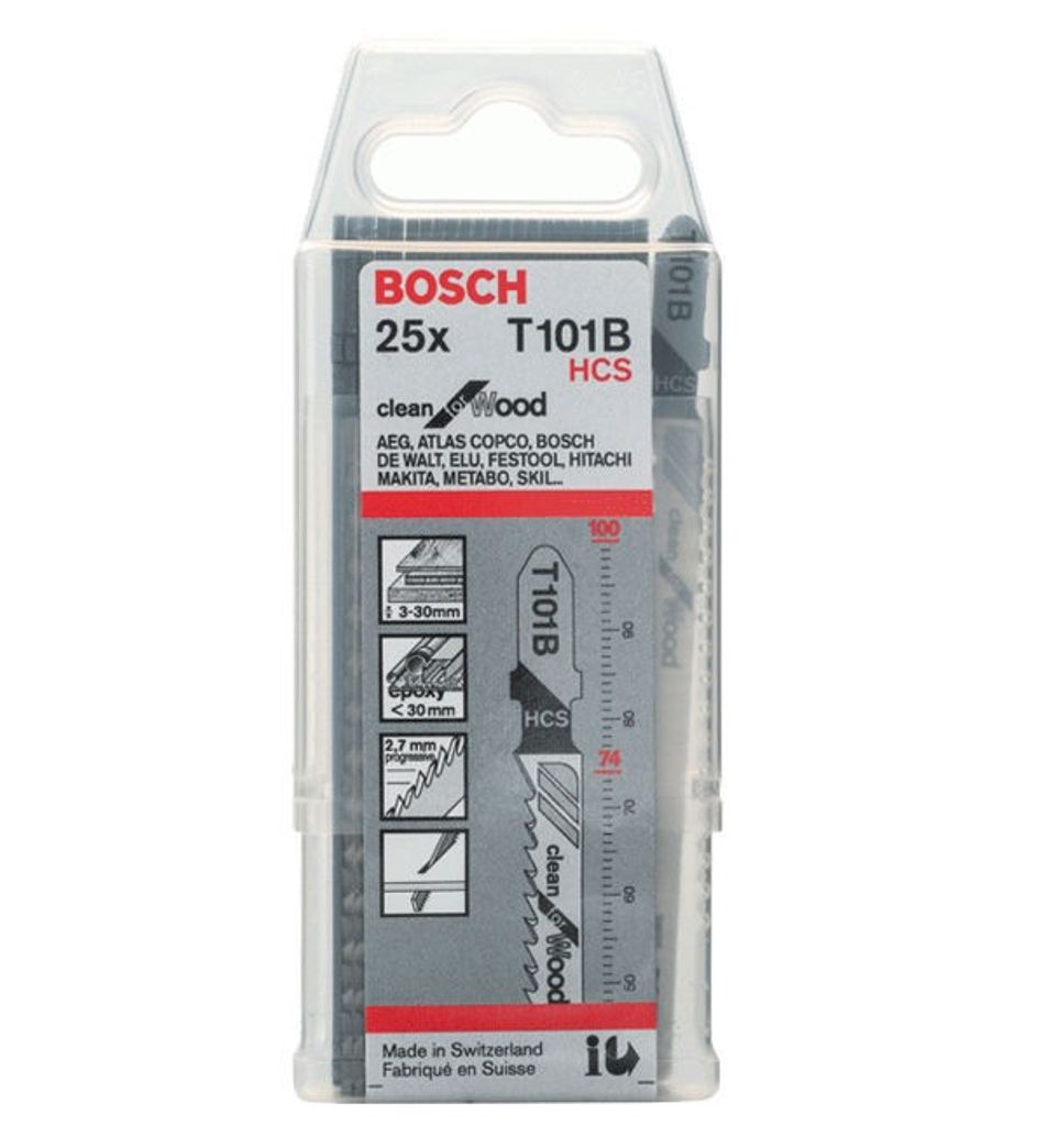 Bosch T101B är idealiskt för sågning i mjuka träslag, spån-, laminat- och boardskivor med tjocklekar upp till 30 mm. Det är också perfekt för plast och epoxi med en diameter mindre än 30 mm. Passar för möbelsnickeri, byggprojekt och hobbyarbeten där rena och exakta snitt krävs.