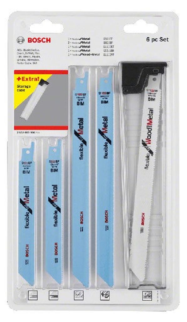 Bosch 6-delars tigersågbladssats med 6 mixade blad för att såga i både trä och metall. Levereras i en praktisk förvaringsask.