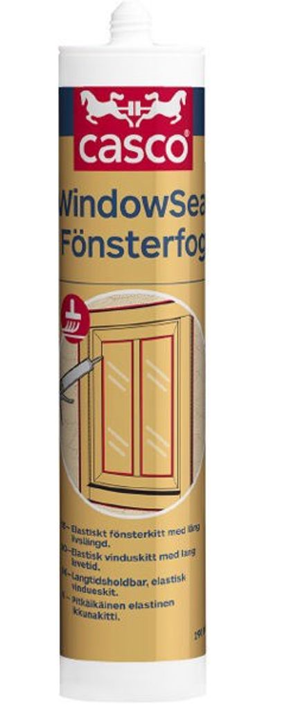Casco Högelastisk fogmassa för renovering och omglasning av fönster. Passar de flesta typer av ramar och har utmärkt fästförmåga mot glas, PVC, trä, aluminum och betong. Krymper ej och är övermålningsbar. Äts inte upp av fåglar som ett traditionellt kitt. Hårdhet: Shore A 30-35, Rörelseförmåga: 20%, Skinnbildning: Ca 10 min, Härdningstid: 2 mm per dag.