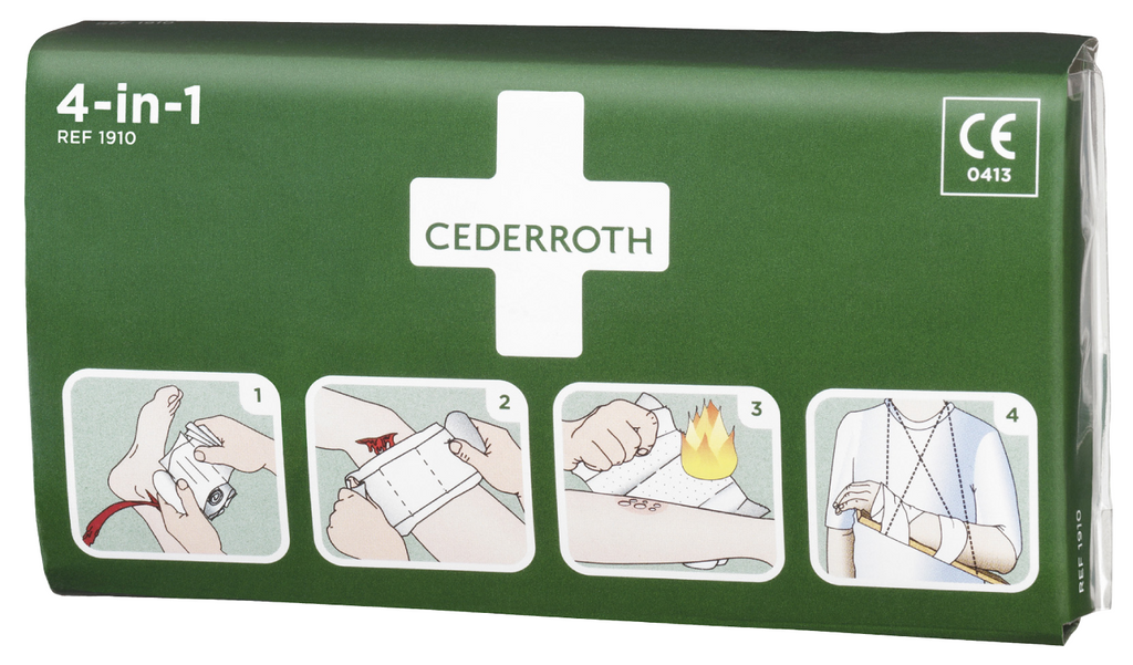 Cederroth Blodstoppare 4-in-1 1910 är ett universalförband med fyra funktioner: tryck-, täck-, brännskade- och stödförband. Förpackningen är försedd med utförliga instruktioner för att ge första hjälpen, vilket gör den enkel att använda även i stressiga situationer.