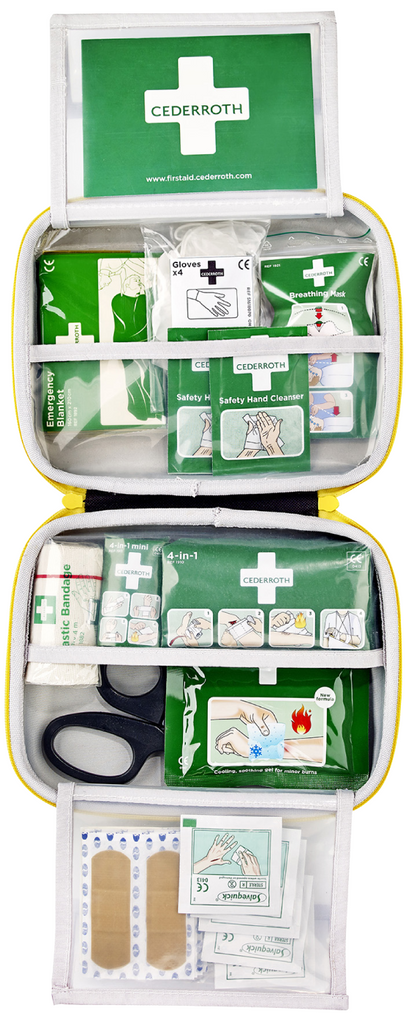 För att behandla skärsår eller liknande skador innehåller kitet också en sax för att klippa bandage, Cederroth 4-in-1 blodstoppare och mini blodstoppare för att snabbt stoppa blödning, samt en Cederroth Burn Gel Dressing för att lindra och skydda brännskador.