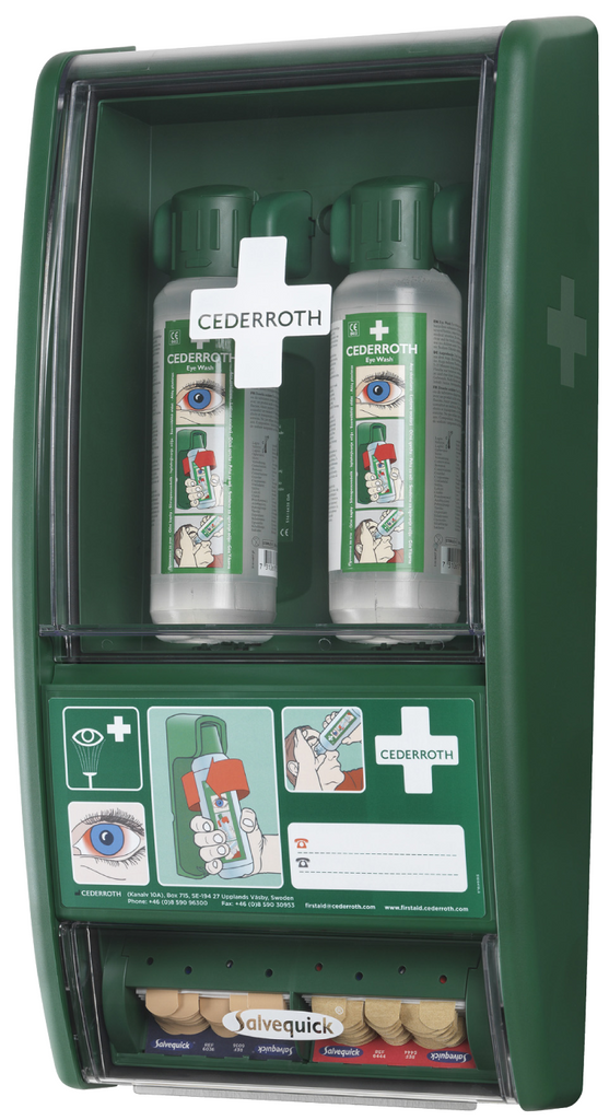 Cederroth ögonduschstation med transparant lucka och gummilister skyddar mot damm och fukt. Förvaringsutrymme bakom luckan som kan kompletteras med olika produkter.