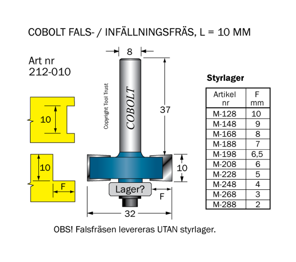 Cobolt 10mm Fals-/Infällningsfräsar med styrlager.