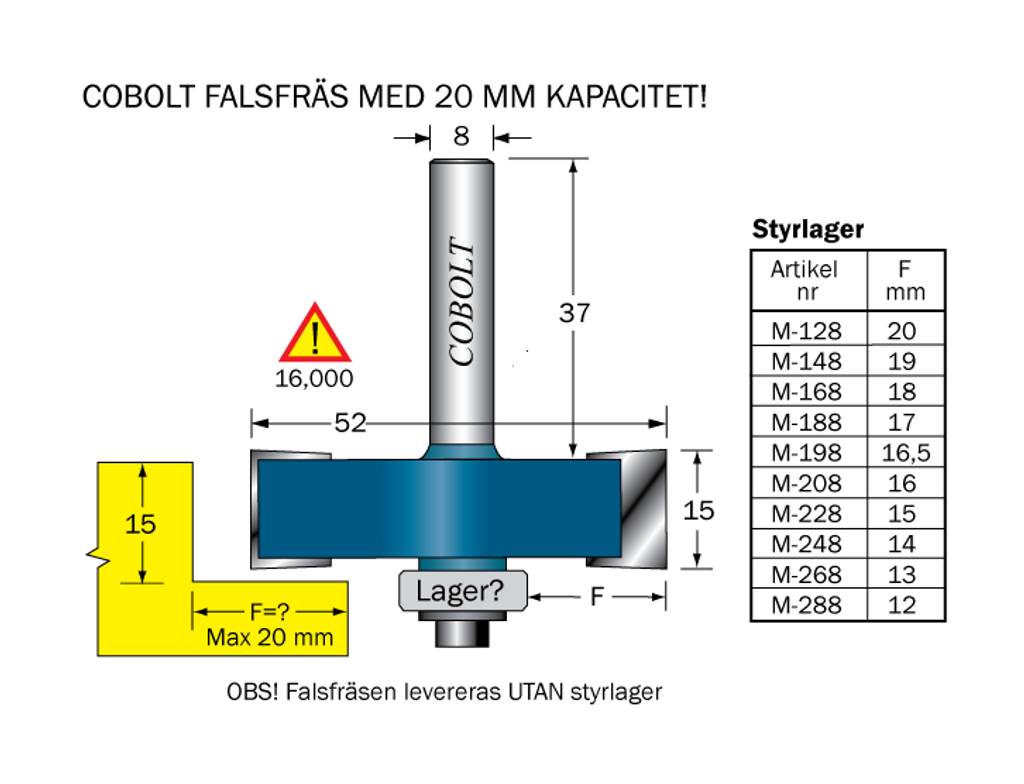 Falsfräs med 20 mm kapacitet. Styrlager beställs separat för önskat F-mått (skärdjup).