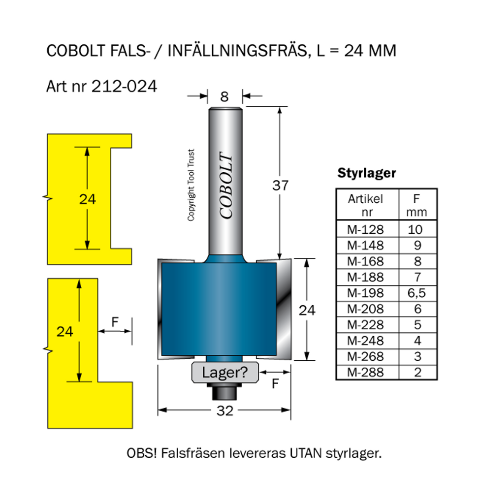 Cobolt 24mm Fals-/Infällningsfräsar med styrlager.