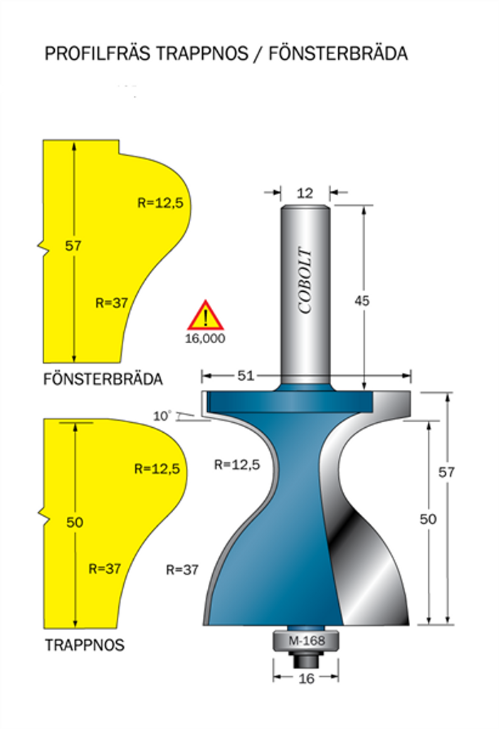 Cobolt Fräs Trappnos / Fönsterbräda D=51 R=12,5 R=37 TL=57 S=12