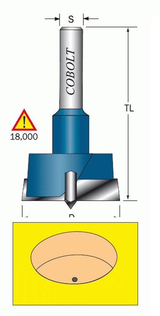 Gångjärnsfräs/Beslagsfräs med hårdmetallskär som ger ett absolut runt och bottenplant hål för montering av beslag och gångjärn. Centrumspets och två vinklade hårdmetallskär.