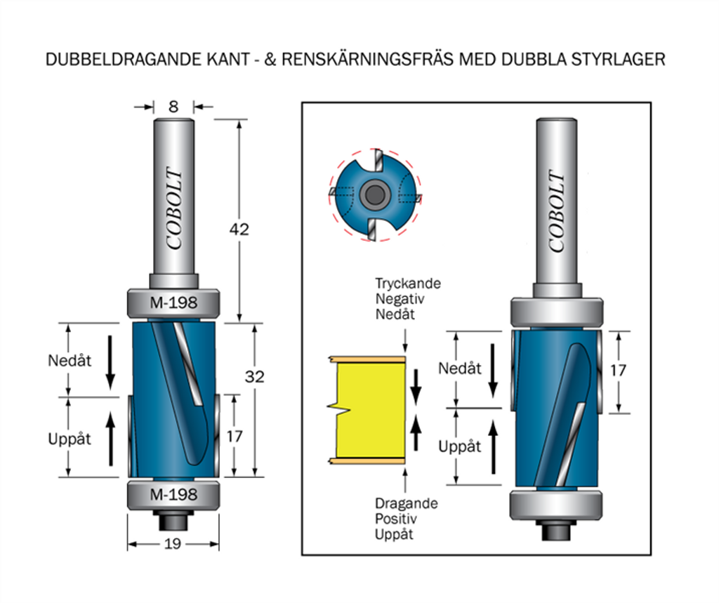 Cobolt Kantfräs dubbeldragande D=19 L=32 TL=74 S=8 POS & NEG med dubbla lager