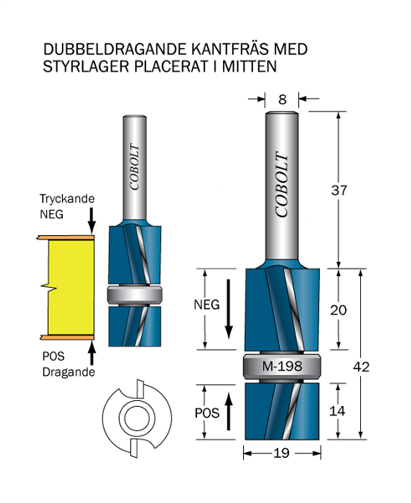 Cobolt Kantfräs med styrlager i mitten POS & NEG D=19 L=42 S=8