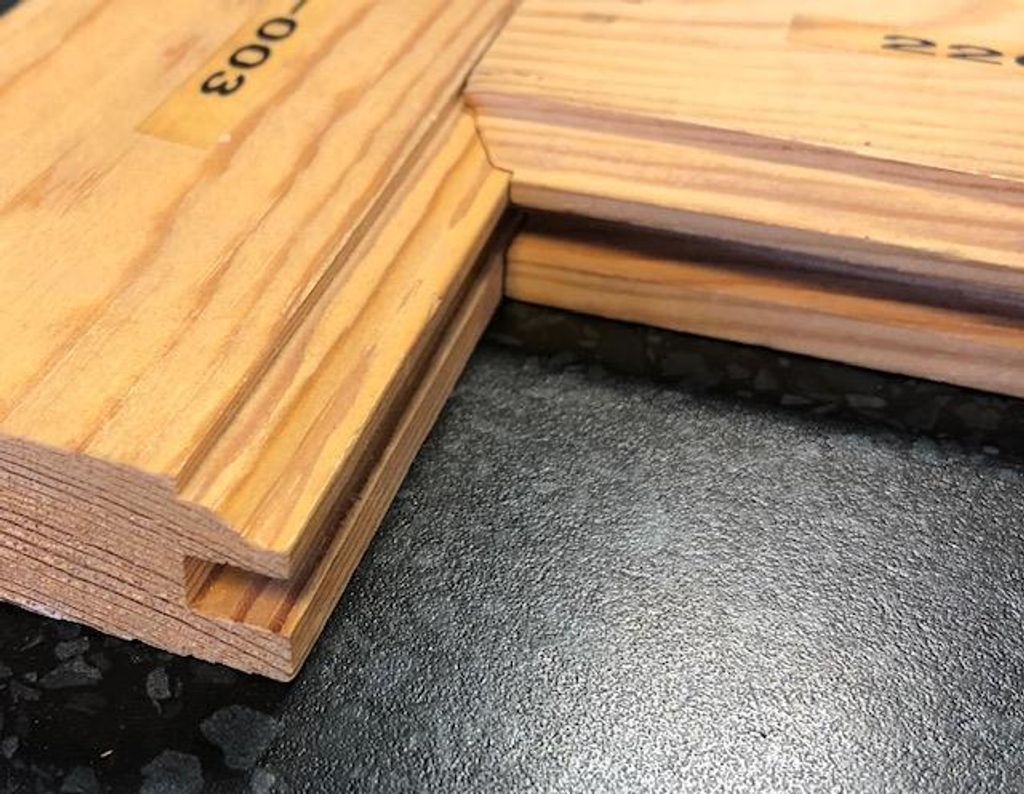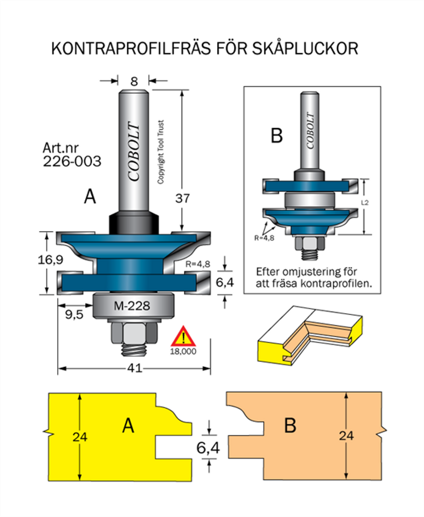 Bild (B) har profil och notstål skiftats och styrlagret flyttats, för att motfogen i tvärstycksgavlarna skall kunna utföras. Ramtjocklek 16-22mm. Om tjockare ram föredras, falsas ramstycken helt enkelt ner från baksidan. Utförlig arbetsinstruktion medföljer i förpackningen.