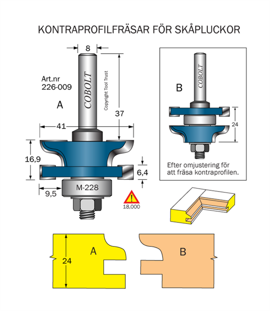 Bild (B) har profil och notstål skiftats och styrlagret flyttats, för att motfogen i tvärstycksgavlarna skall kunna utföras. Ramtjocklek 16-22mm. Om tjockare ram föredras, falsas ramstycken helt enkelt ner från baksidan. Utförlig arbetsinstruktion medföljer i förpackningen.