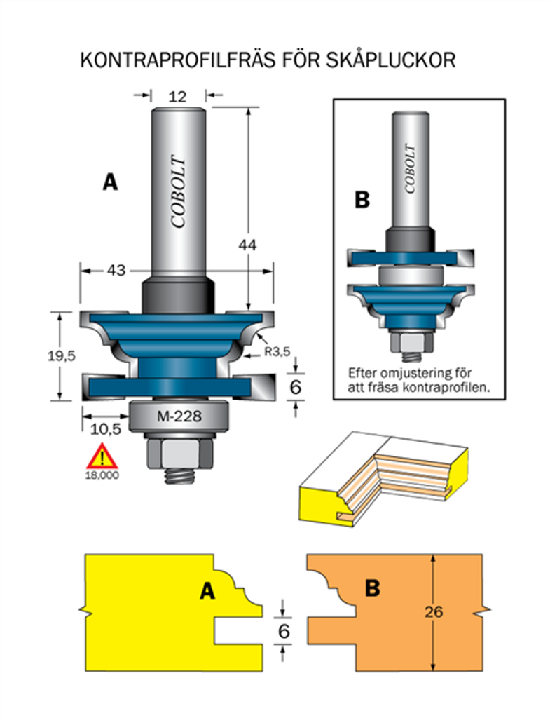 Kontraprofilfräs för skåpluckor. Med styrlager M-228.