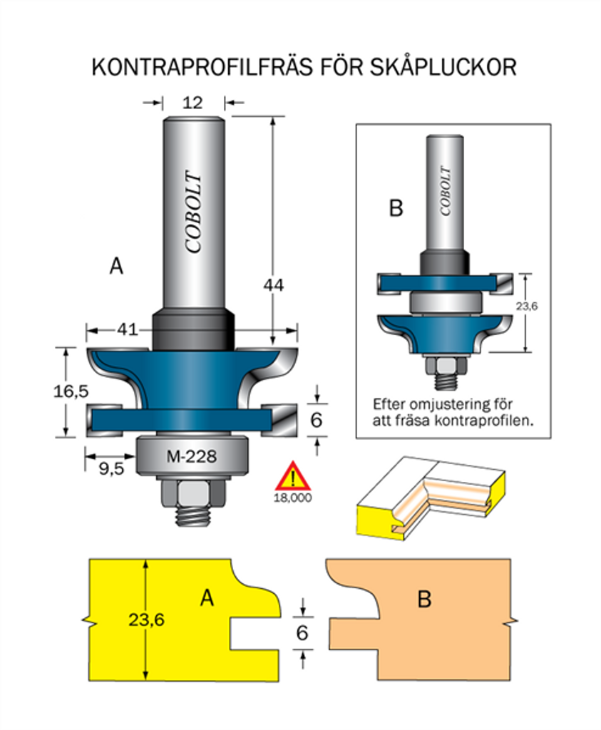 Kontraprofilfräs för skåpluckor. Med styrlager M-228.