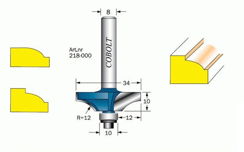 Just denna kvartsstavsfräsen har en flack profil. Flack profil är ett attraktivt alternativ med flack avrunding istället för kvartstavsfr'seks 90-graders båge. Ger 2mm undre fals.