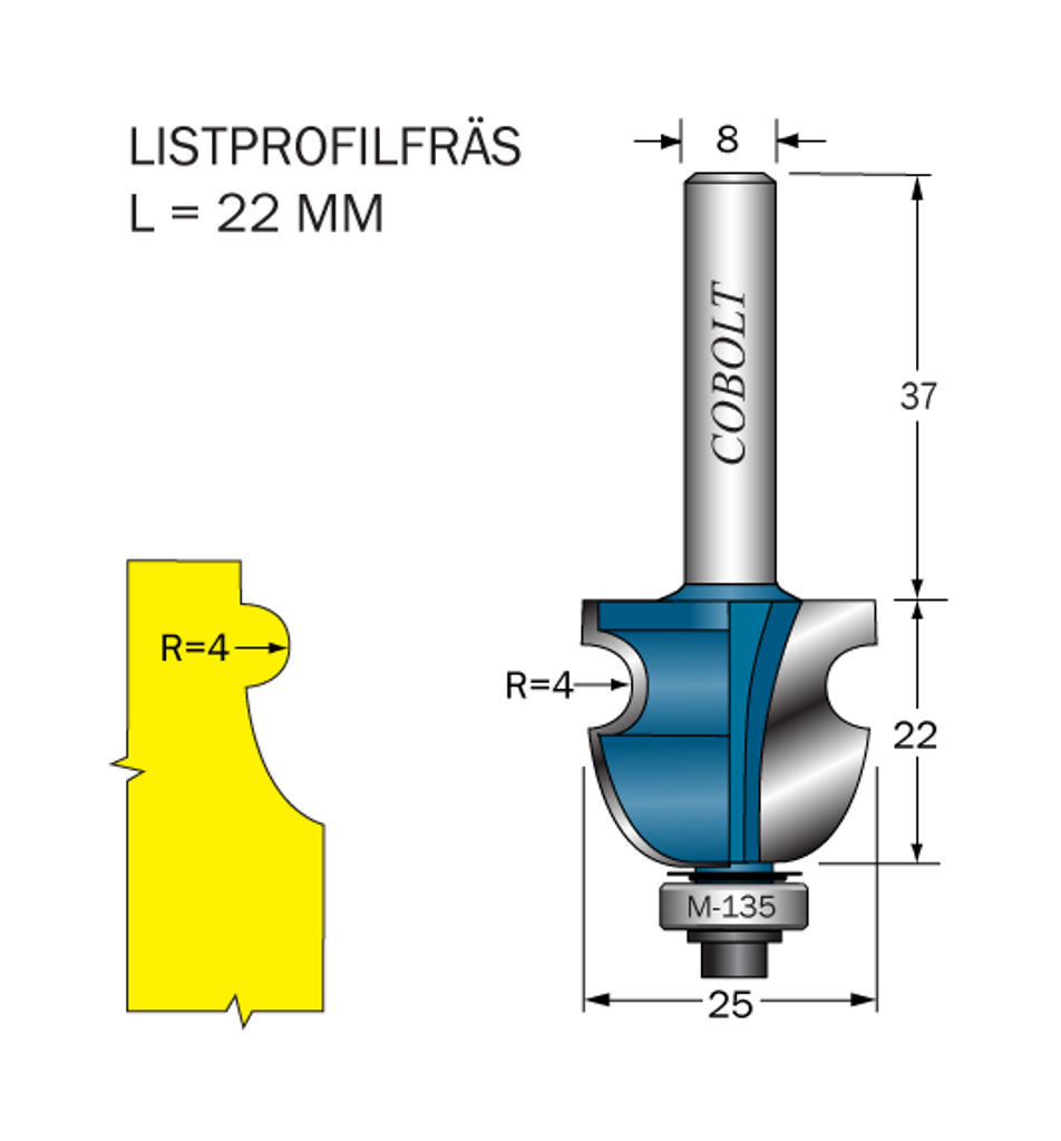Cobolt Listprofilfräs D=25 L=22 R=4 S=8