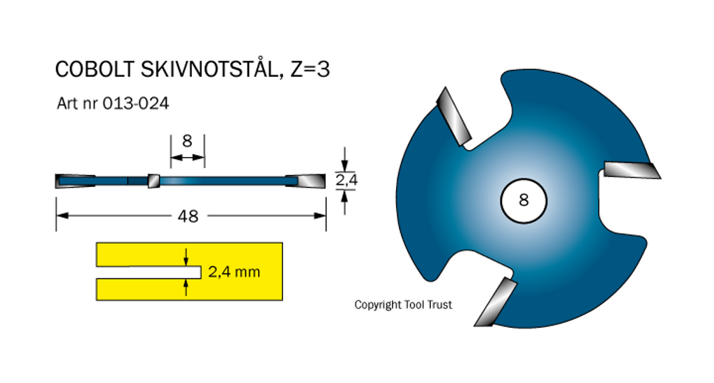 Cobolt 2,4mm Skivnotstål utan spindel. Skivnotstål är perfekta att använda vud t.e.x reparation eller mönsterläggning av parkett och laminatgolv. Med Cobolt notskiva tillsammans med Cobolt spindel för skivnotstål så kan du själv beställa vilken tjocklek och vilket djup spåret skall vara genom att enkelt byta notskivan. Du kan även fräsa flera spår samtidigt om så vill.