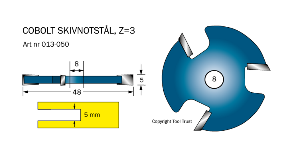 Cobolt 5,0mm Skivnotstål utan spindel. Skivnotstål är perfekta att använda vud t.e.x reparation eller mönsterläggning av parkett och laminatgolv. Med Cobolt notskiva tillsammans med Cobolt spindel för skivnotstål så kan du själv beställa vilken tjocklek och vilket djup spåret skall vara genom att enkelt byta notskivan. Du kan även fräsa flera spår samtidigt om så vill.