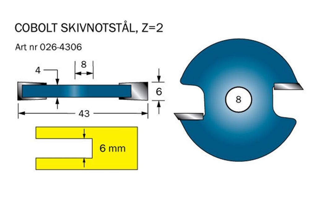 Cobolt 6mm Skivnotstål utan spindel. Skivnotstål är perfekta att använda vud t.e.x reparation eller mönsterläggning av parkett och laminatgolv. Med Cobolt notskiva tillsammans med Cobolt spindel för skivnotstål så kan du själv beställa vilken tjocklek och vilket djup spåret skall vara genom att enkelt byta notskivan. Du kan även fräsa flera spår samtidigt om så vill.