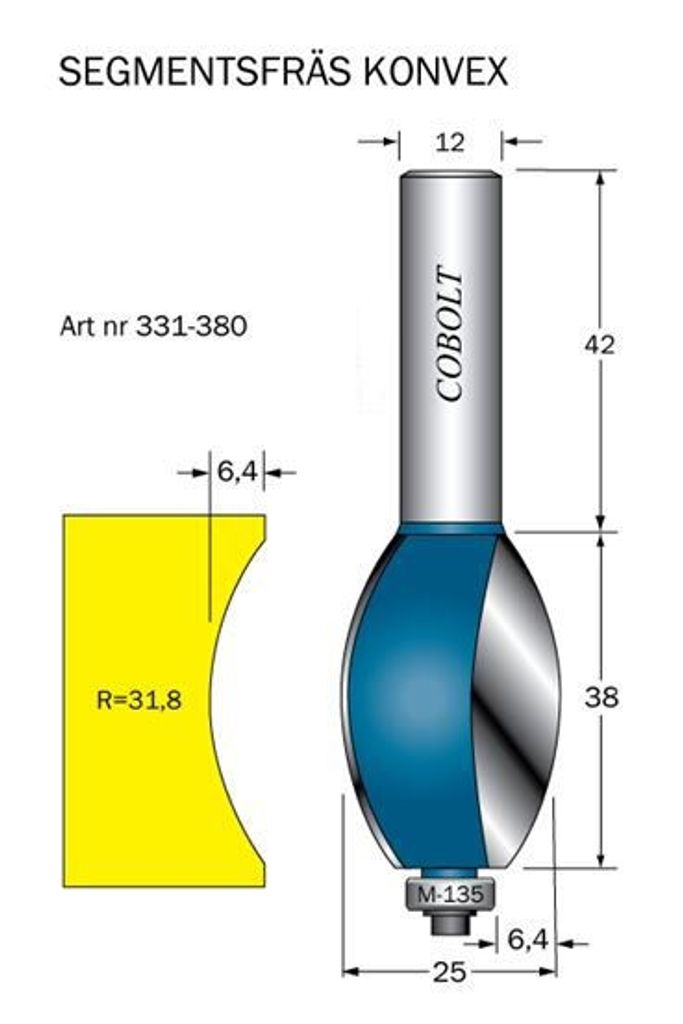 Cobolt segmentsfräs med konvex yta med en fräshöjd på 38mm och en spindeldiameter på 12mm.