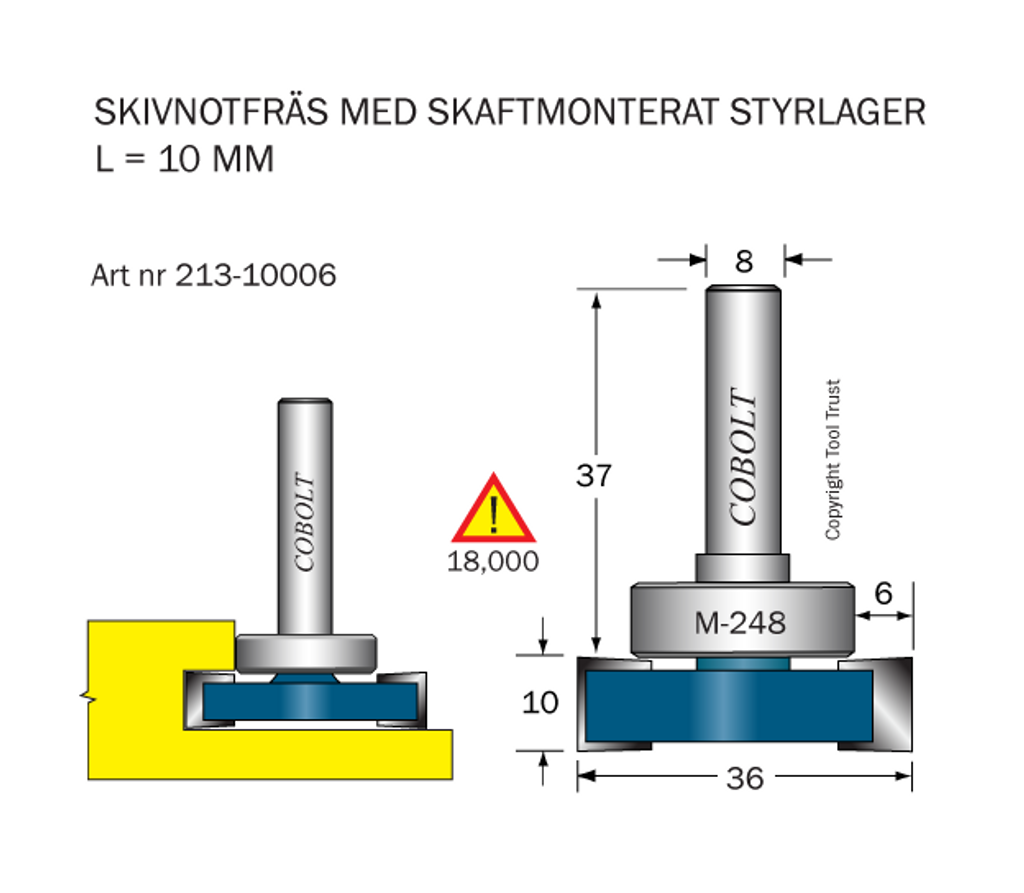 Tvåskärig skivnotfräs med skaftmonterat styrlager och helt slät undersida på notskivan för maximal åtkomlighet. Utmärkt att använda vid reparation eller mönsterläggning av parkett och laminatgolv, då fräsning av notspår kan utföras på redan lagt golv, vid lagning där befintlig spont används eller vid komplettering av lös fkäder. Även för fräsning av spår tätt intill fönsterkarm för montering av tätningslist.