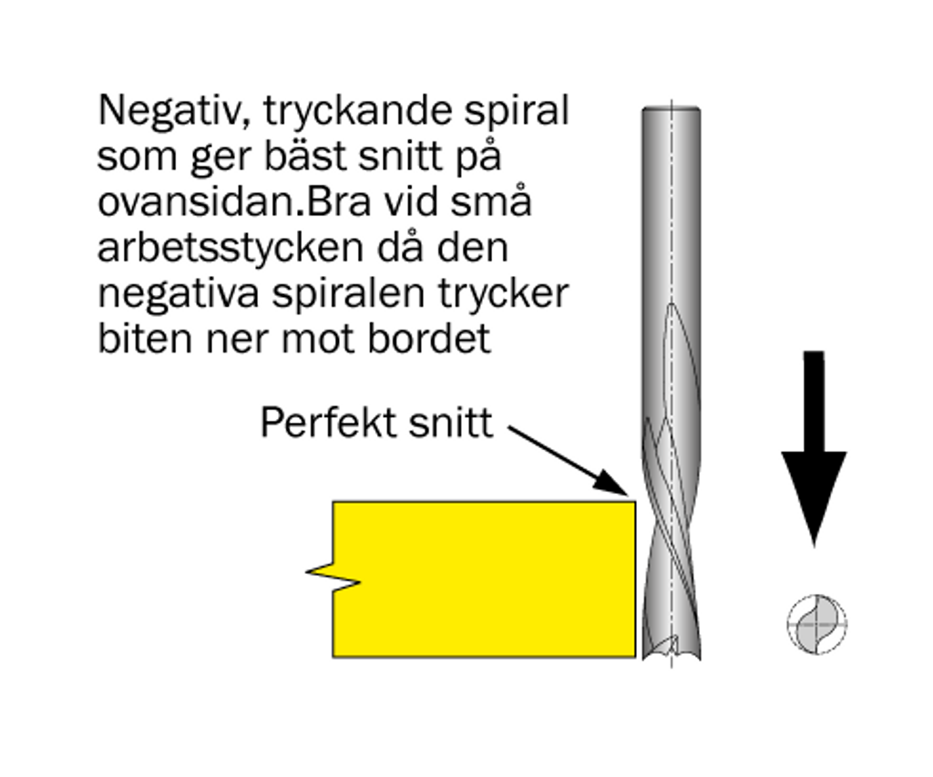 - Negativ spiral trycker nedåt och ger en perfekt snittyta på materialets översida. Negativ spiral är bäst vid bearbetning av små arbetsstycken och för att hålla materialet fast i vaccumjigg.