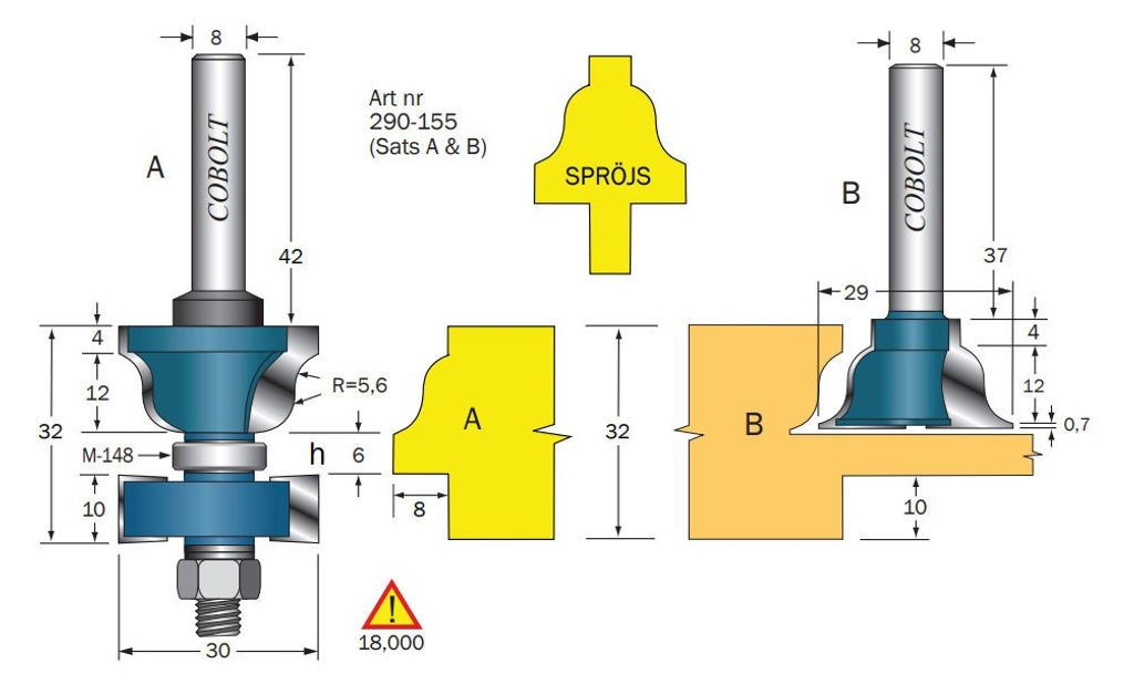 Cobolt Spröjsfräs-sats Skaftdiameter 8mm. Med flackare / brantare profil som är mycket vanlig i äldre byggnader. Fräs A gör dekorprofil och fals med samma gång. Fräs B gör kontraprofil samt tapp för sammanfogning.