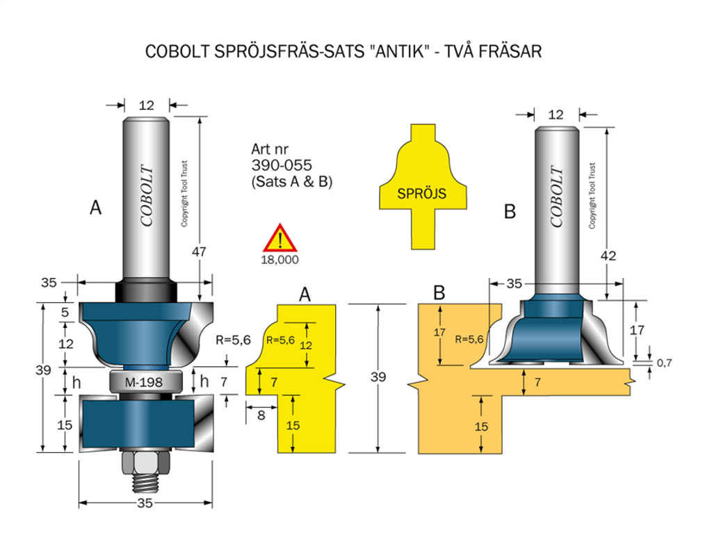 Cobolt spröjsfräs-sats. Med en flackare/brantare profil som är mycket vanlig i äldre byggnader. Fräs A gör dekorprofil och fals på samma gång. Fräs B gör kontraprofil samt tapp för sammanfogning.