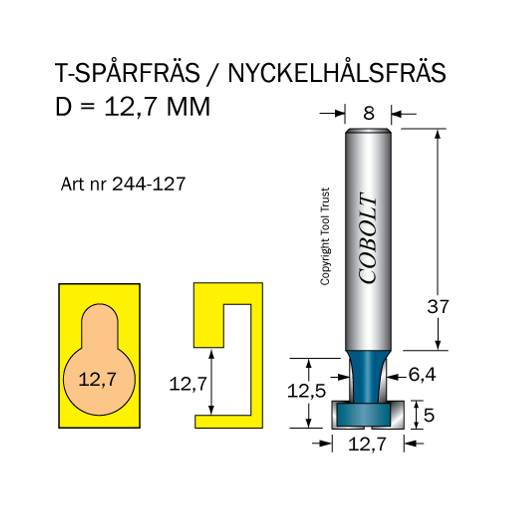 Cooblt T-spårfräs/Nyckelhålsfräs är ett frässtål som fräser ett nyckehplsformat upphängningshål för skruv på t.e.x tavlor, väggur, speglar, trofésköldar & vapensköldar.