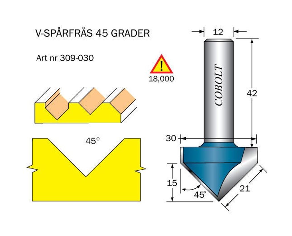 Cobolt V-spårfräs 45grad, D=30, L=15 S=12mm