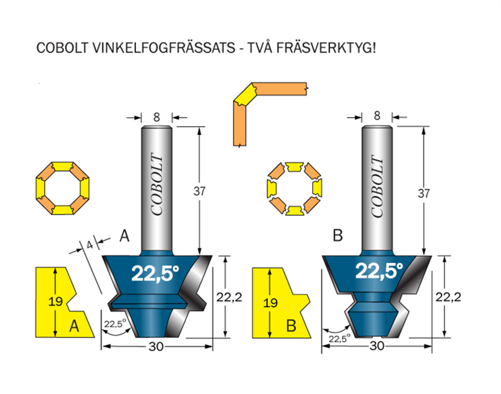Cobolt vinkelfogfräs-sats 22,5 grader - två verktyg.