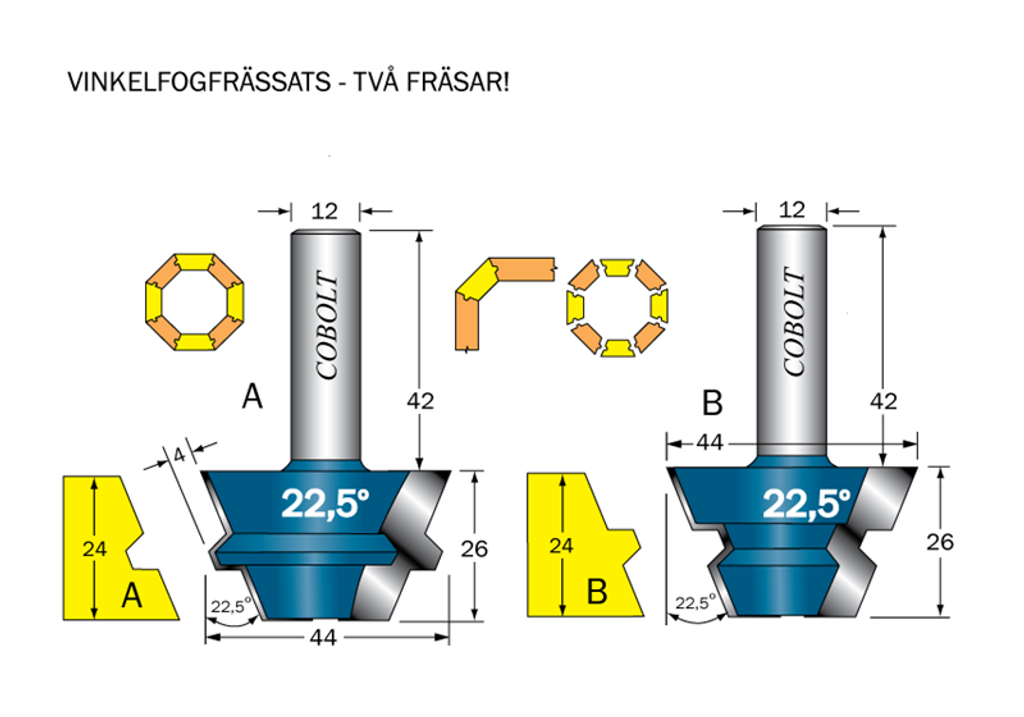 Cobolt vinkelfogfräs-sats 22,5 grader - två verktyg.