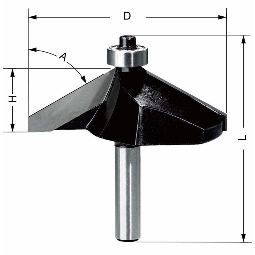 Delver 45 graders fasfräs för kantavfräsning på jämna och svängda ytor. Fasfräsen har monterat kullagor i botten som styr fräsen mot arbetsstycket. Fasfräsen är tvåskärig med HM-stål samt bottenmonterat kullager.