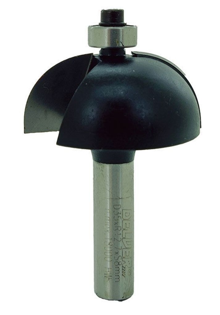 Delver Hålkälsfräs med 35 mm diameter och 12,7 radie, utrustad med ett styrlager. Användbar för kantprofiler, flush trimming, kopieringsfräsning, spår och fasningar, dörrar och fönster, och mycket mer.
