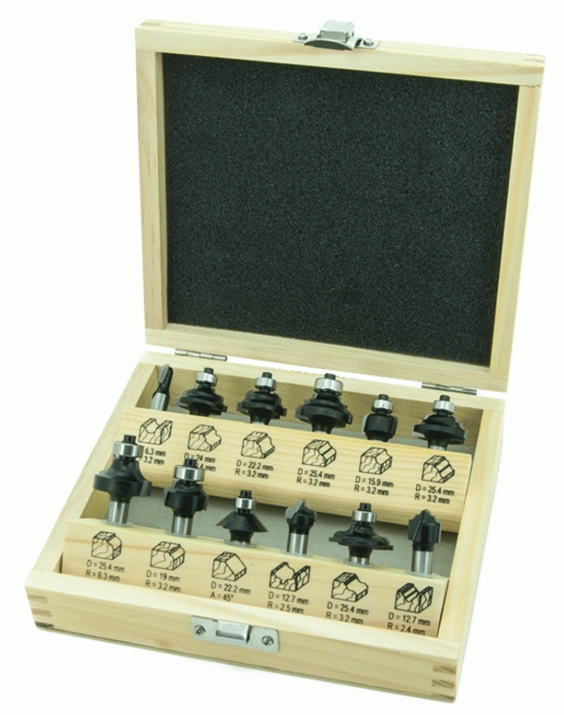 Tydliga mått under varje frässtål för att enkelt se vilken form/radio som fräses med stålet. Frässtålen levereras i en praktiskt, kraftig och slagtålig förvaringsväska av trä.