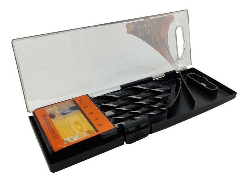 Delver träborrsats bestående av 5st högkvalitativa träborr i en praktisk förvaringsask. Centreringsspets för enklare centrering över hålet.