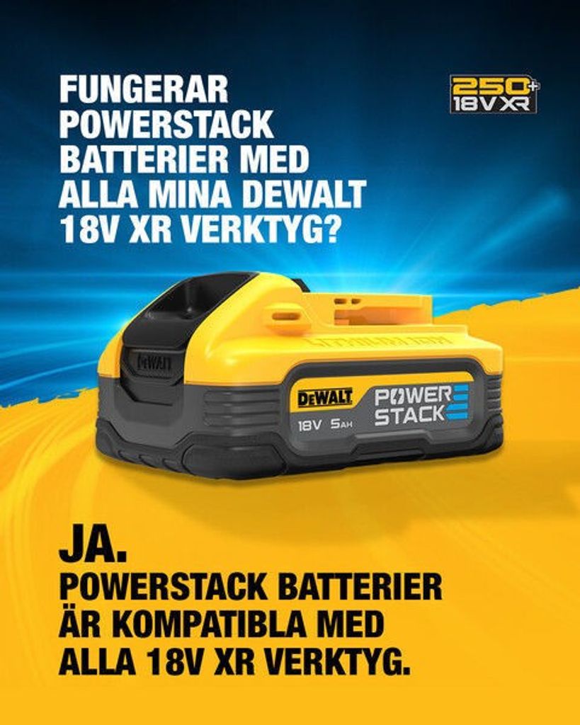 DeWalt Powerstack är en ny batteriteknologi som är utvecklad för att förbättra prestanda, livslängd och laddningstid för DeWalt-batterier. Powerstack-batterier är designade för att vara kompatibla med DeWalt 18V XR-seriens elverktyg och erbjuder en rad fördelar jämfört med traditionella litiumjonbatterier.