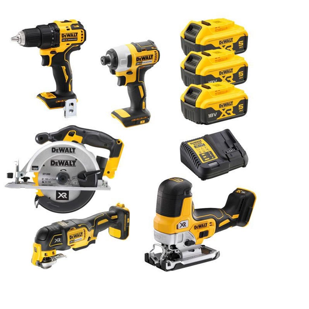 DeWalt DCK555P3 är ett komplett verktygspaket bestående av DCD708 Borrskruvdragare, DCF787 Slagskruvdragare, DCS391N Cirkelsåg, DCS335N Sticksåg, DCS355 Multiverktyg, 3st 18V 5,0ah batterier, laddare och en tygväska till förvaring.