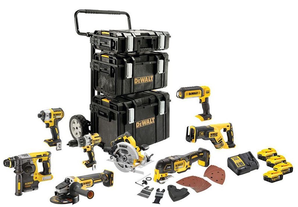 DeWalt DCK853P4 är ett komplett verktygspaket med verktyg, t-stak förvaringslådor, batterier och laddare. Verktygspaketet levereras inkl. vagn för att förenkla transporten av verktygen.