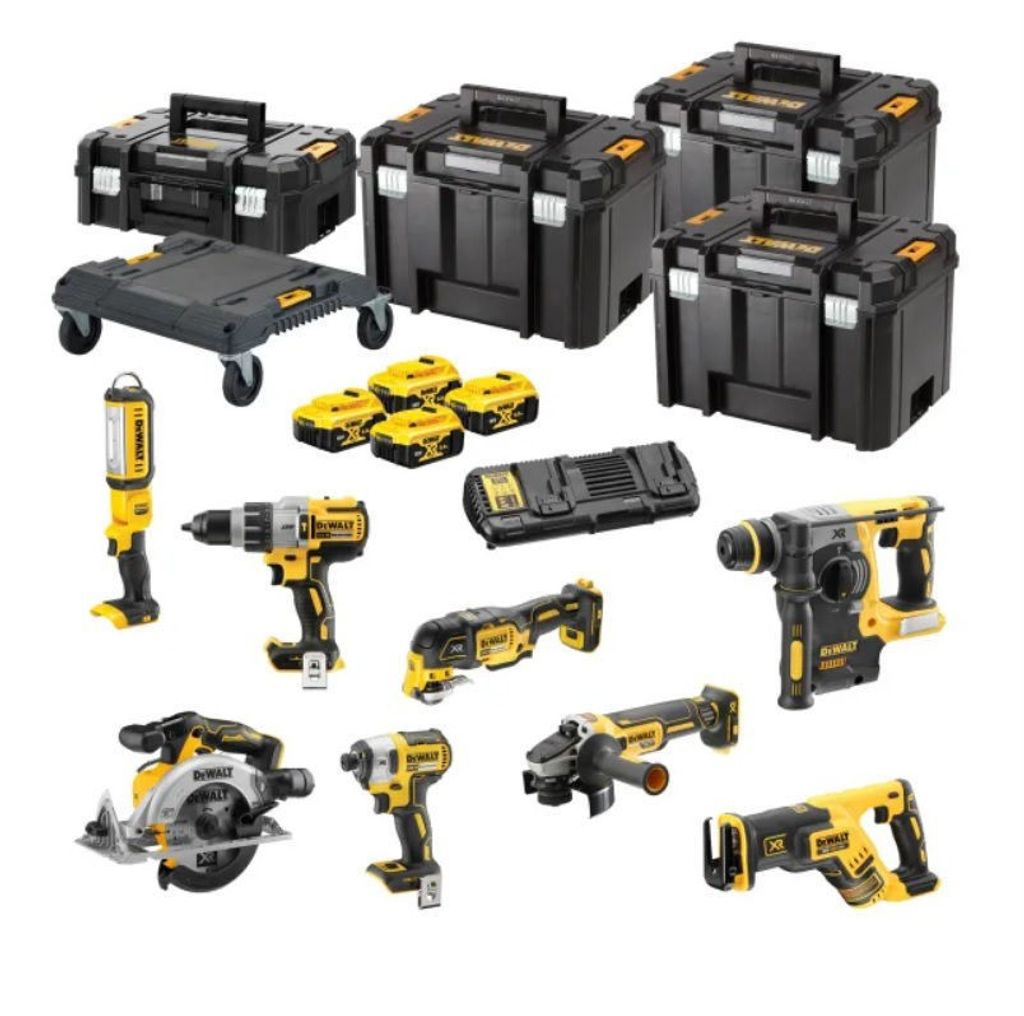 DeWalt DCK853P4T är ett verktygspaket innehållande åtta kolborstfria 18V XR-maskiner, batterier, laddare samt TSTAK-lådor och kärra.